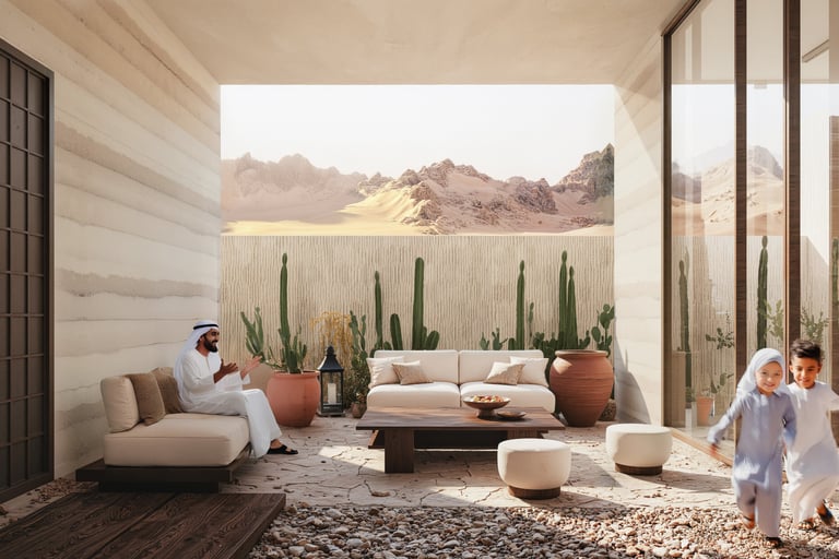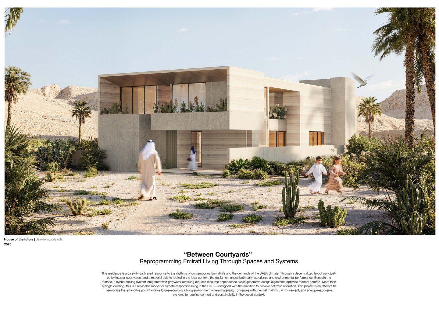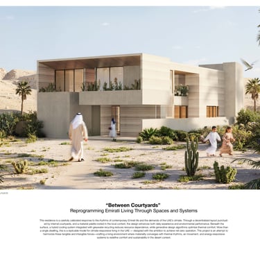 House of the Future 2025 is a forward-looking home that fuses Emirati heritage with advanced design strategies to create a self-sustaining, climate-responsive living environment. Inspired by traditional courtyard houses and majlis culture, the design reinterprets privacy, gathering, and inward-focused living for a contemporary context.