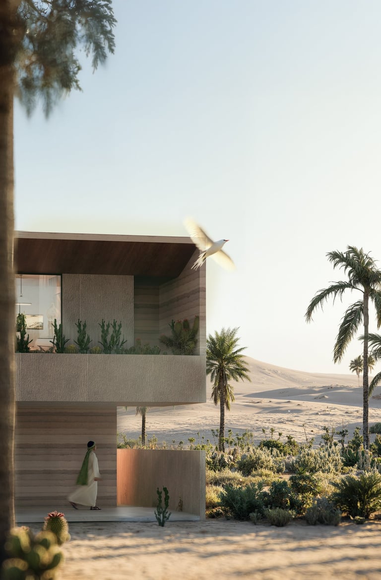 Inside, a series of interconnected courtyards anchors the plan, blurring boundaries between indoor and outdoor spaces. Daylight, cross-ventilation, and layered landscaping create a calm yet vibrant setting that balances privacy with openness — a contemporary expression of Emirati living traditions.