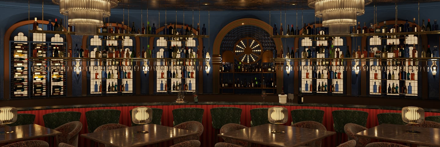 Conceived as both a destination and a performance, this project transforms the traditional dining experience into a sensory journey. Arched thresholds and velvet drapery frame a central stage, blurring the line between entertainment and atmosphere. The bar area glows beneath a gilded ceiling, while chandeliers and sculptural lighting add layers of drama to every gathering.