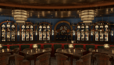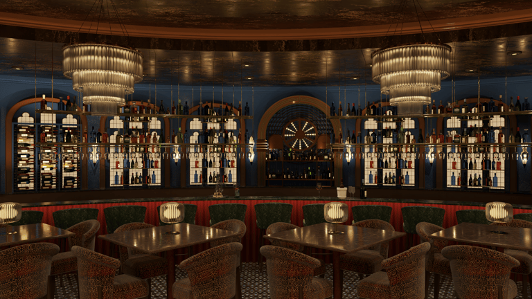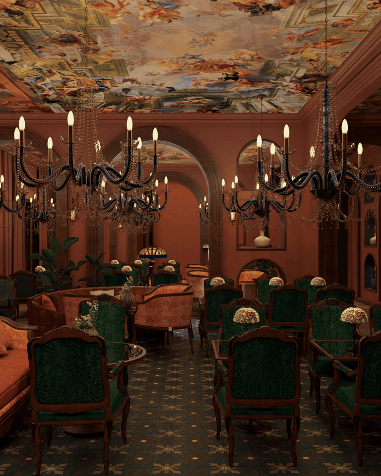 Each room carries its own identity: dining salons adorned with painted ceilings and lush upholstery, intimate corridors lined with curated artwork, and alcoves that invite quieter conversations. The palette of jewel tones and rich textures establishes an immersive continuity, weaving grandeur with intimacy.