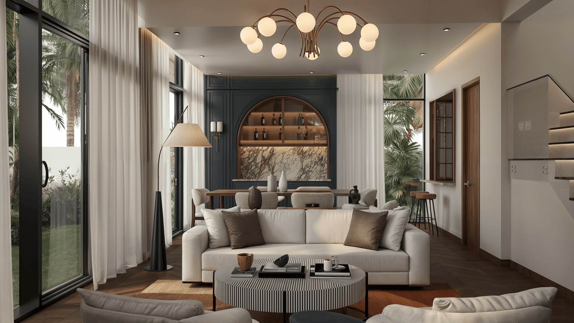 Subtle architectural detailing lends rhythm, while curated accents and personal touches bring depth and intimacy. The result is a home that flows seamlessly between sophistication and warmth — a sanctuary designed for both living and belonging.