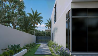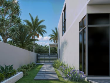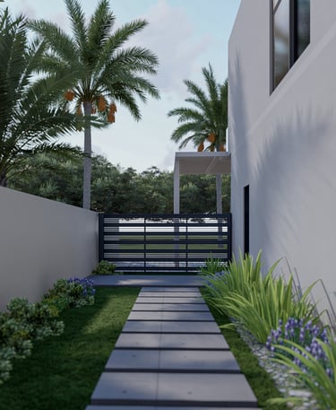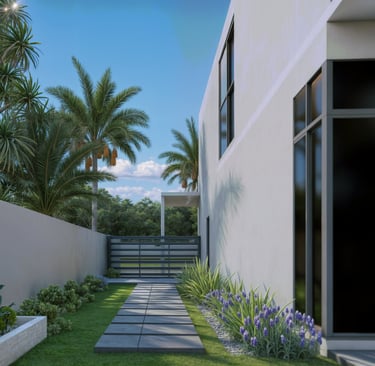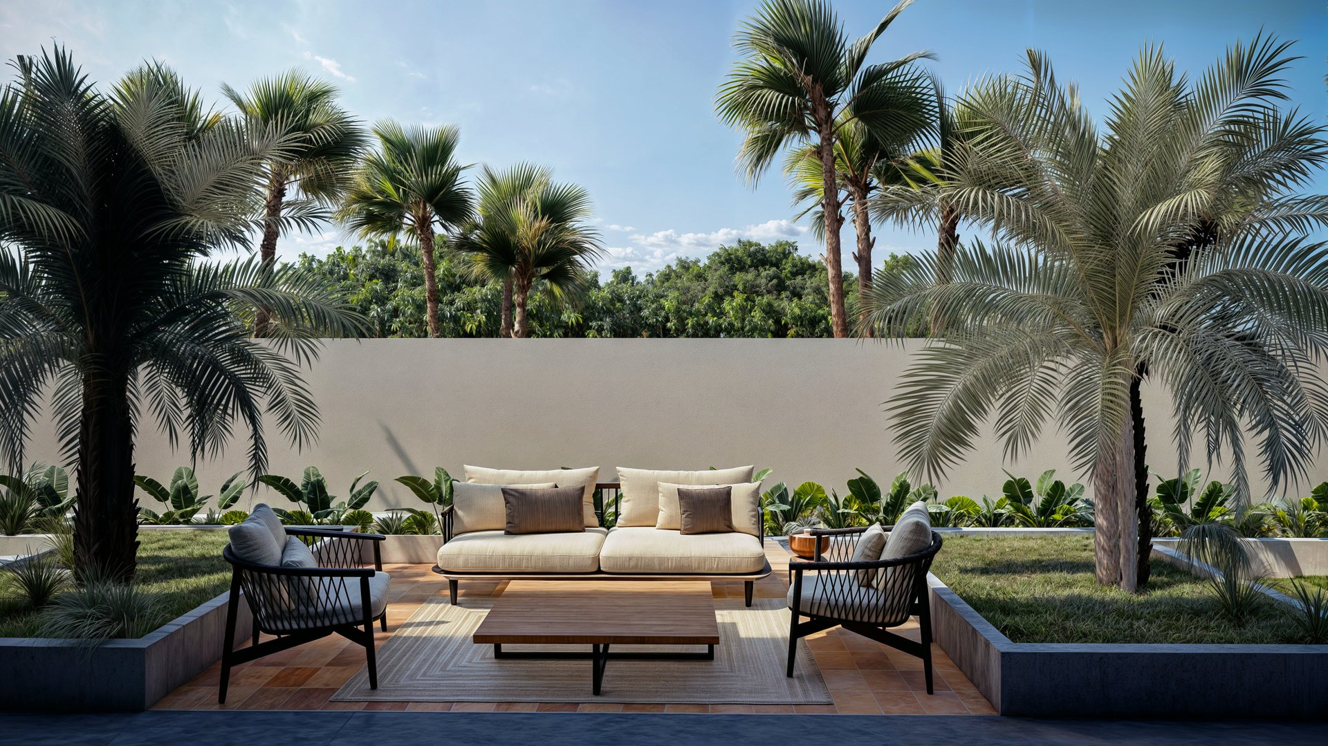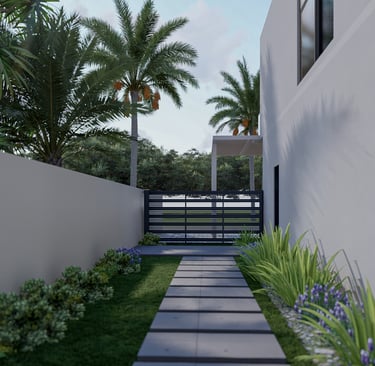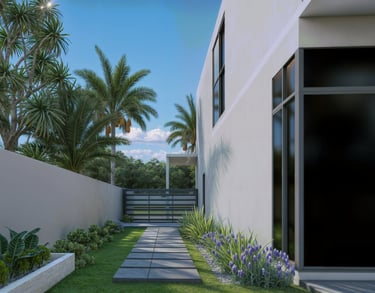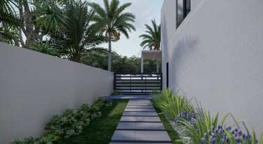 A contemporary garden designed as an extension of the home, this landscape balances structure with softness. Linear pathways and sculpted beds create a quiet order, while lush planting and tropical silhouettes infuse the space with vitality. Seating zones are carefully framed by greenery, transforming the outdoors into a series of intimate living rooms under open sky. The result is a landscape that feels like a tranquil stage for daily rituals and gathering alike.