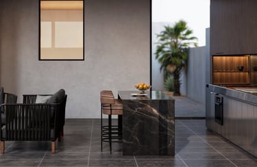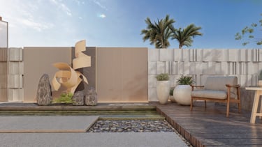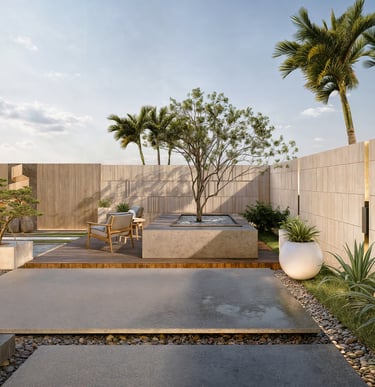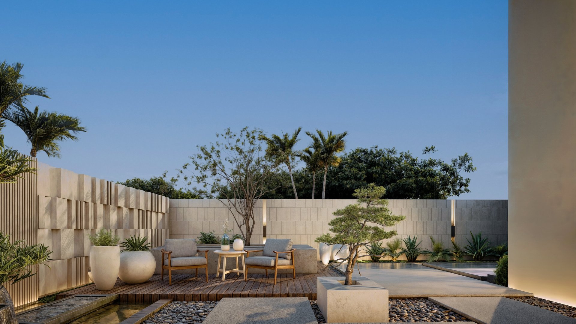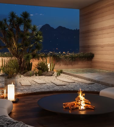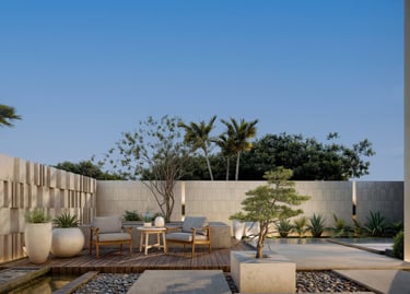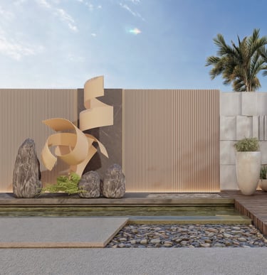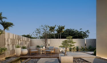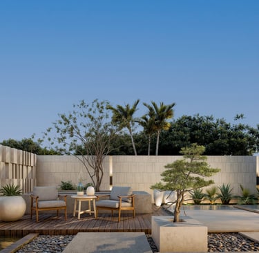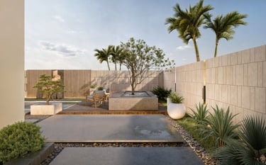 This landscape is conceived as a series of sculpted moments. Planes of stone, timber, and water create a meditative rhythm, softened by curated greenery that anchors the scene without excess. The design embraces contrast: raw textures against smooth finishes, solid masses against open voids, to establish balance and depth. Seating enclaves are seamlessly woven into the composition, transforming the space into a haven of quiet sophistication and understated luxury.