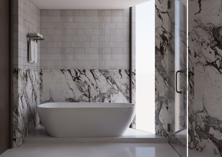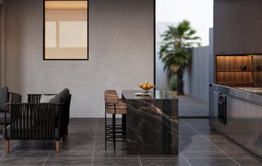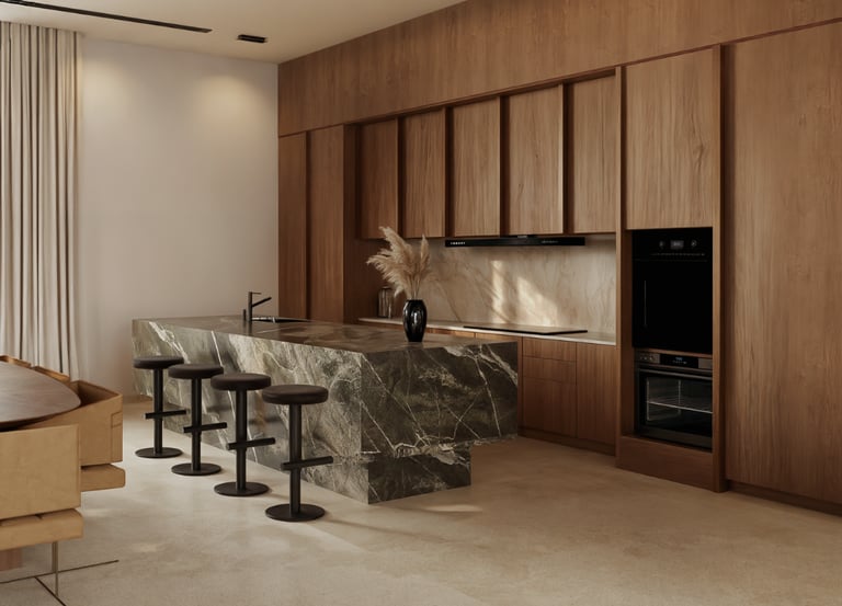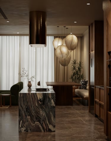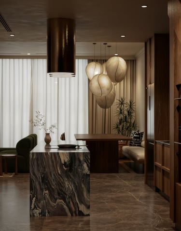 This project is a journey through spaces where deep, organic textures and vibrant natural stone are the protagonists, complemented by the warmth of polished woods and thoughtful lighting.