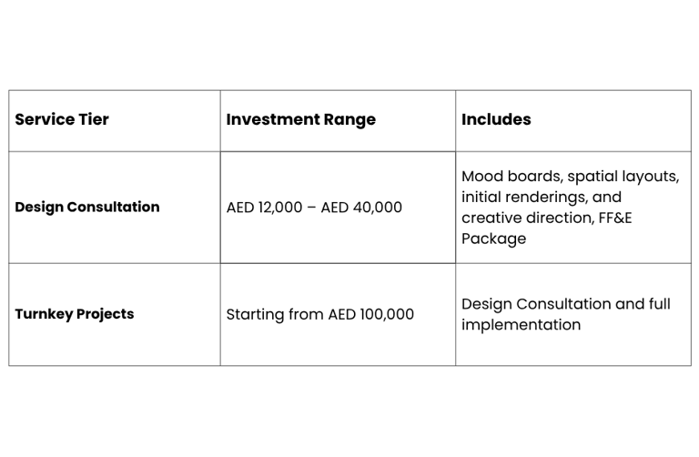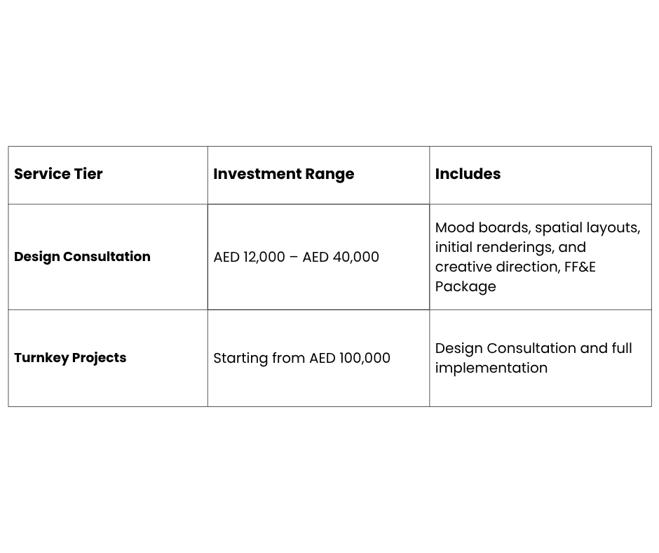 Our pricing reflects the standards of high-end residential interior design in Dubai, designed to offer flexibility, transparency, and exceptional value. We offer two main structures: