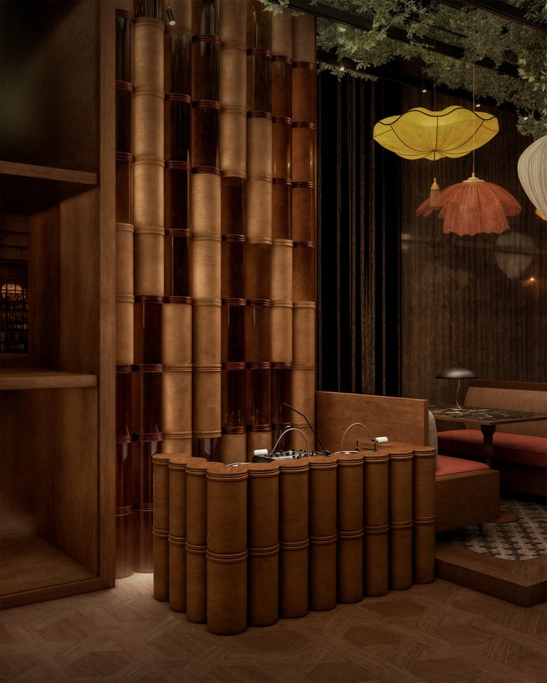 The spatial planning was meticulously crafted to guide the guest through a series of distinct, yet interconnected dining experiences. From the intimate nooks defined by fluted wood panels and bespoke lantern lighting to the expansive bar areas with their striking green bar stools, each zone offers a unique perspective and ambiance. The interplay of light and shadow was carefully orchestrated through a mix of ambient, task, and accent lighting, enhancing the rich colour story and material textures. This deliberate layering of natural and engineered elements culminates in a highly immersive and memorable destination.