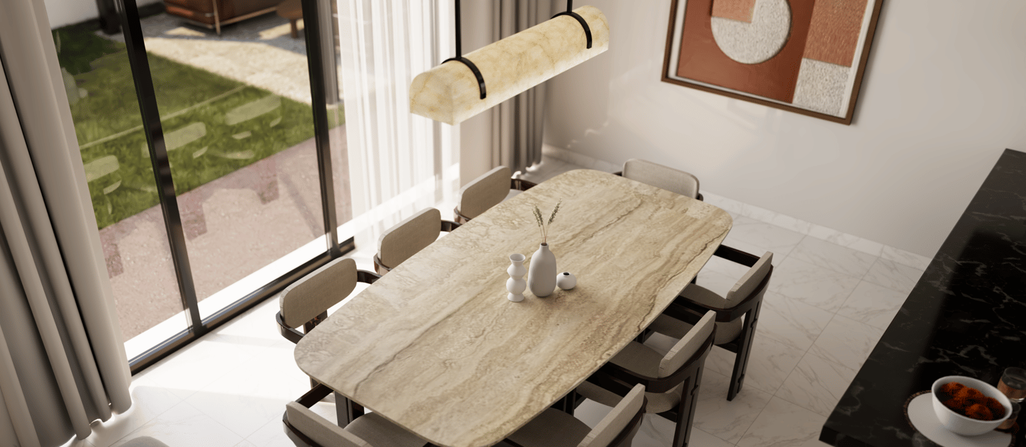 Light is used as the primary tool of atmosphere. Cove lighting traces architectural lines, sculptural pendants introduce moments of focus, and daylight filters through expansive glazing to animate the neutral palette. The effect is one of calm transitions—where the interplay of interior and exterior is softened and continuous.