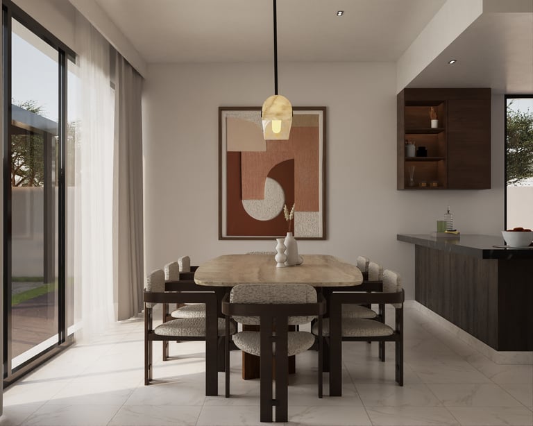 The palette is rooted in natural expression—muted timber tones, softly veined stone, and tactile fabrics set against smooth plaster and brushed metal accents. Subtle contrasts between matte and reflective finishes add quiet depth, maintaining cohesion across the villa.