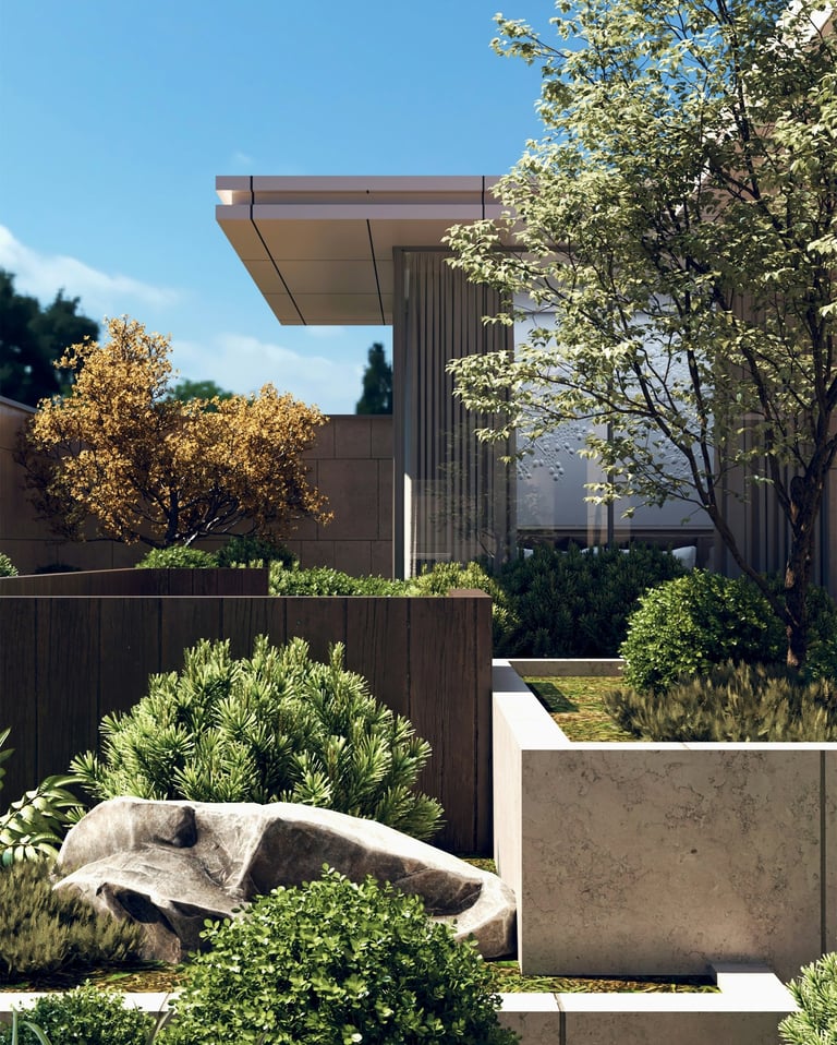 Characterized by clean lines, restrained color palettes, and hardscape-dominant layouts, this style emphasizes visual simplicity and elegance. Plant variety is kept minimal, and features are often geometric or sculptural. While it is generally easier to maintain, attention to material selection is critical: surfaces must resist high UV exposure and heat expansion. Integrating shade for plants and seating areas, along with careful orientation of hardscape elements, ensures comfort and longevity in the UAE sun.