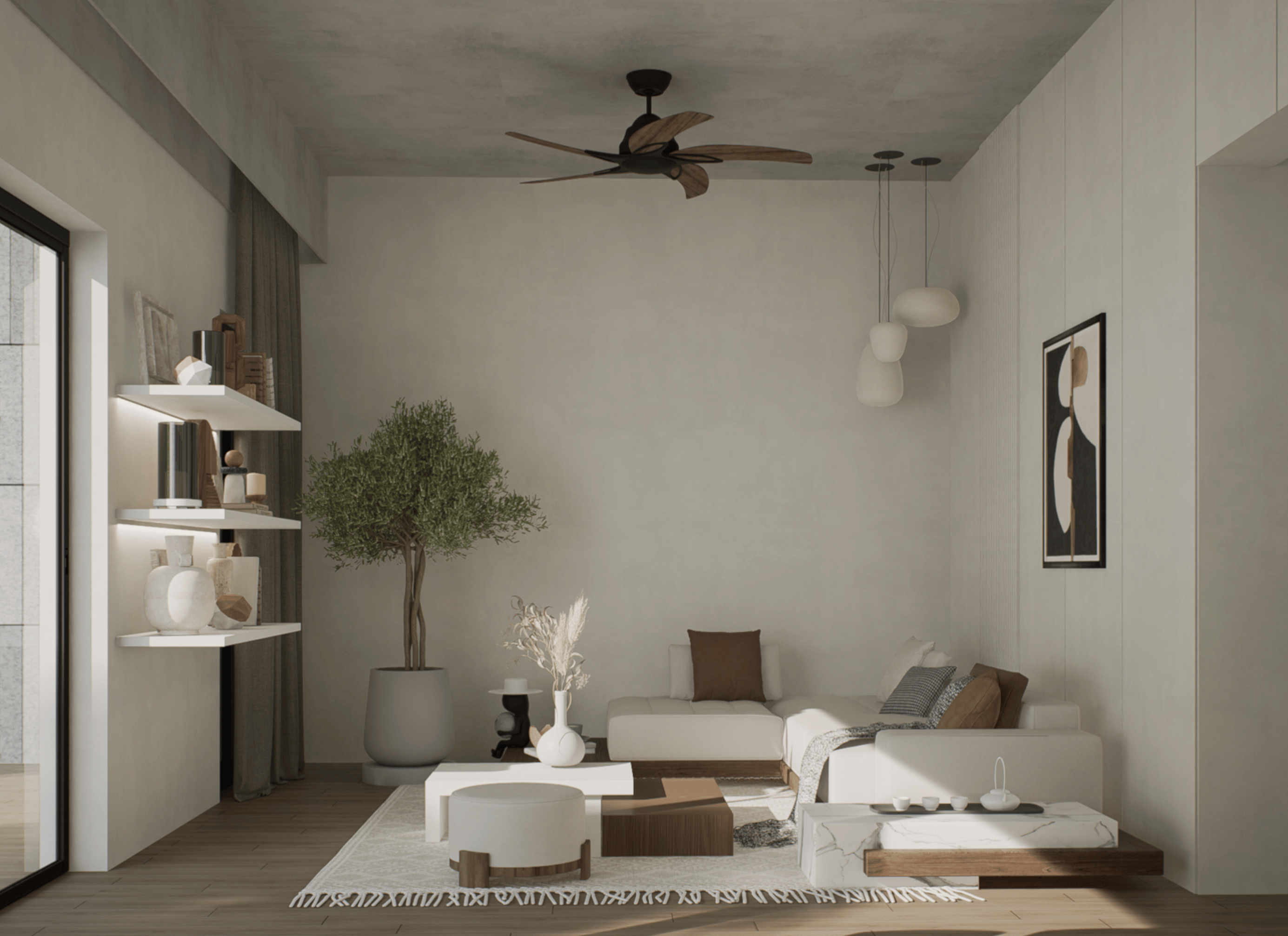 Through this delicate interplay, we create an environment that exudes a serene and tranquil aura. 'The Minimal Abode' invites you to immerse yourself in spaces curated for calmness, where the artful equilibrium of simple design elements evokes a deep sense of tranquility. Each element in the project is chosen with intention, from the use of natural materials to the careful selection of art and furnishings. This creates a cohesive, harmonious atmosphere that invites a sense of calm and renewal. The space is defined by its tranquil ambiance, where light and shadow create a gentle interplay, adding depth and warmth to the interiors.