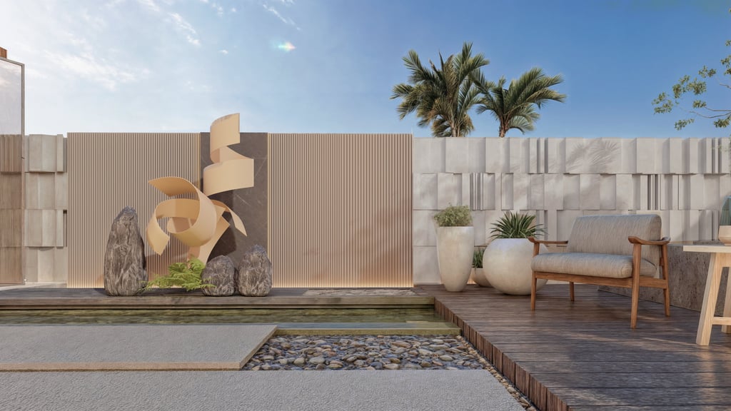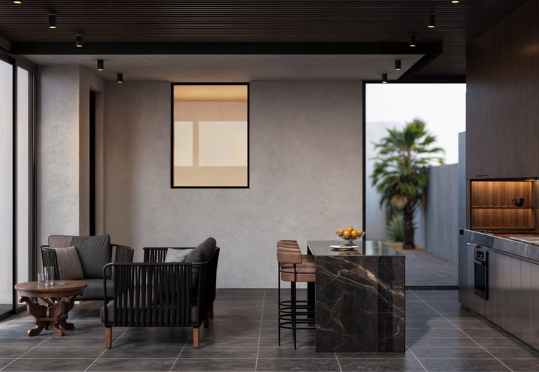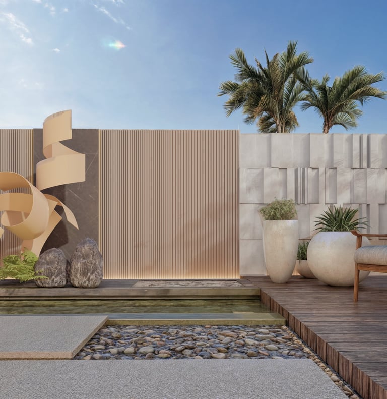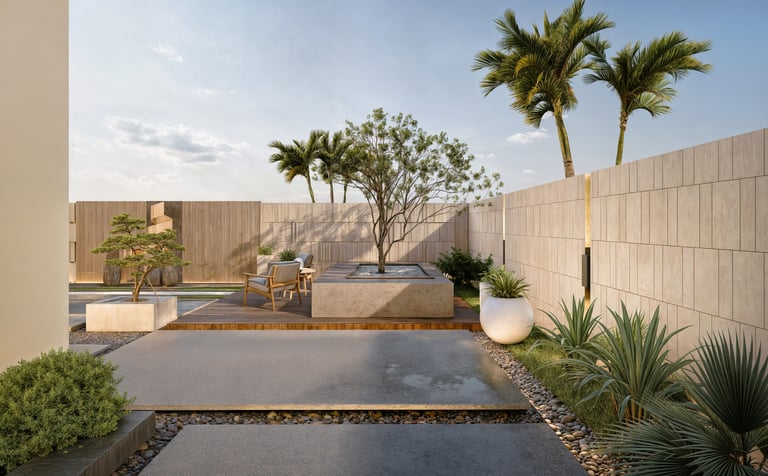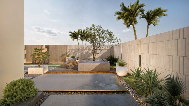 This landscape is conceived as a series of sculpted moments. Planes of stone, timber, and water create a meditative rhythm, softened by curated greenery that anchors the scene without excess. The design embraces contrast: raw textures against smooth finishes, solid masses against open voids, to establish balance and depth. Seating enclaves are seamlessly woven into the composition, transforming the space into a haven of quiet sophistication and understated luxury.