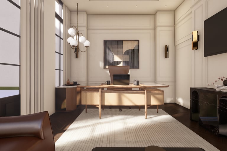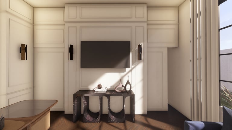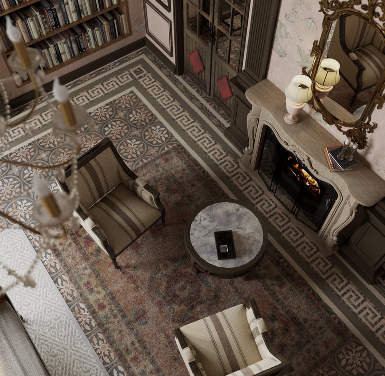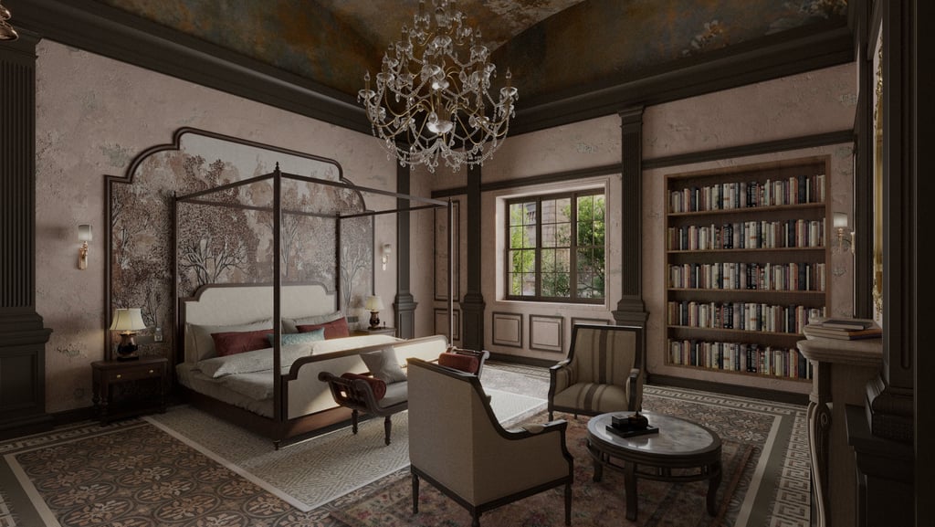 This project is a study in storytelling through design. It first leads you into a realm of reimagined old-world charm, where a soft blush palette and rich leather create an atmosphere of cultivated comfort and layered history.