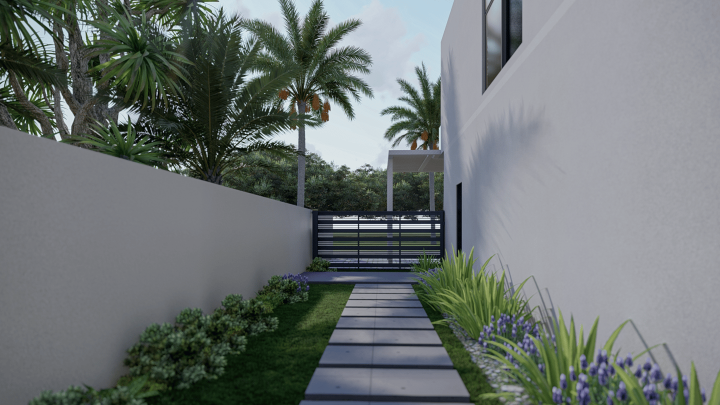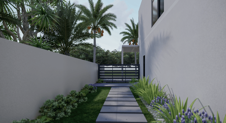 A contemporary garden designed as an extension of the home, this landscape balances structure with softness. Linear pathways and sculpted beds create a quiet order, while lush planting and tropical silhouettes infuse the space with vitality. Seating zones are carefully framed by greenery, transforming the outdoors into a series of intimate living rooms under open sky. The result is a landscape that feels like a tranquil stage for daily rituals and gathering alike.