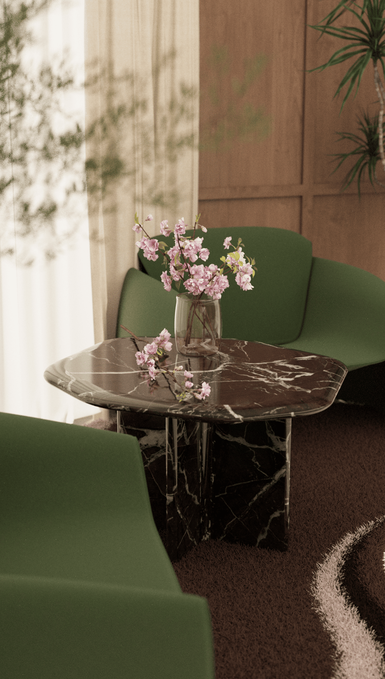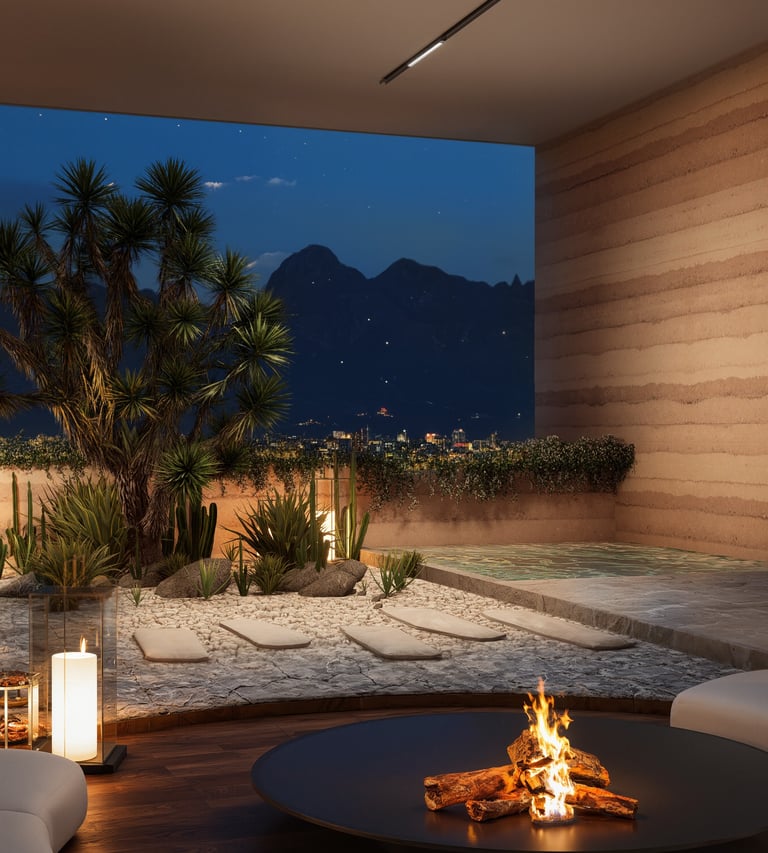 This project is a journey through spaces where deep, organic textures and vibrant natural stone are the protagonists, complemented by the warmth of polished woods and thoughtful lighting.