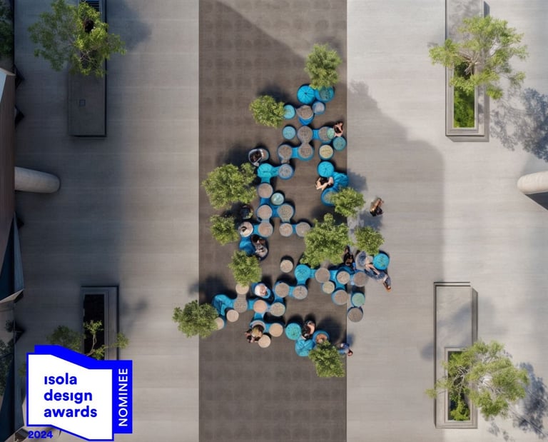 Table-Scape redefines the table as infrastructure—a modular installation that transforms outdoor space into a flexible terrain for gathering, dialogue, and cultural exchange. Engineered from recycled Polygood discs and steel rods, the system invites interaction and reshaping, adapting fluidly to the rhythms of urban life.