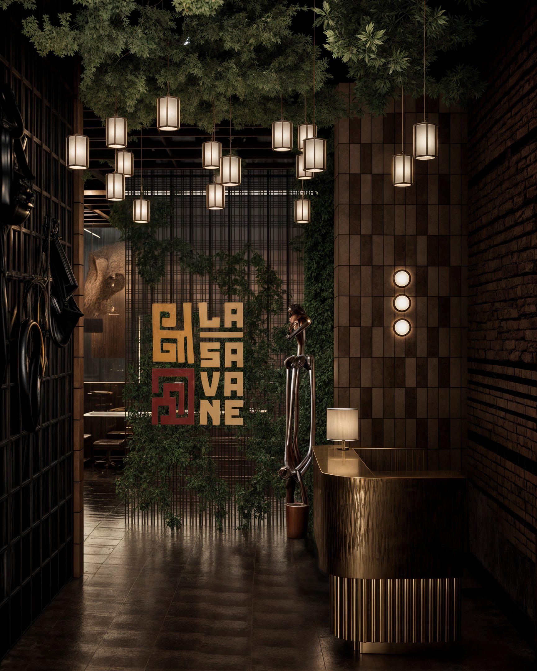 This project was conceived as an escape—a vibrant, multi-sensory environment designed to transport diners from the urban landscape into an enchanted, theatrical realm. The core vision was to blend the raw, dynamic energy of the city with the profound tranquility and lushness of nature, creating a space that feels both cutting-edge and timeless. This was achieved by strategically employing a rich material palette: raw brickwork and textured concrete provide an authentic, grounding foundation, while polished brass accents, deep-toned woods, and sumptuous velvets introduce layers of refined luxury and sophisticated comfort. The overhead verdant canopy, a signature element, not only enhances acoustics and visual depth but also evokes the feeling of stepping into a hidden garden, immediately setting a mood of discovery and wonder.