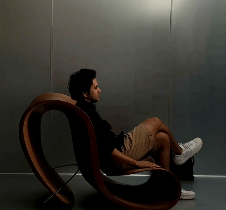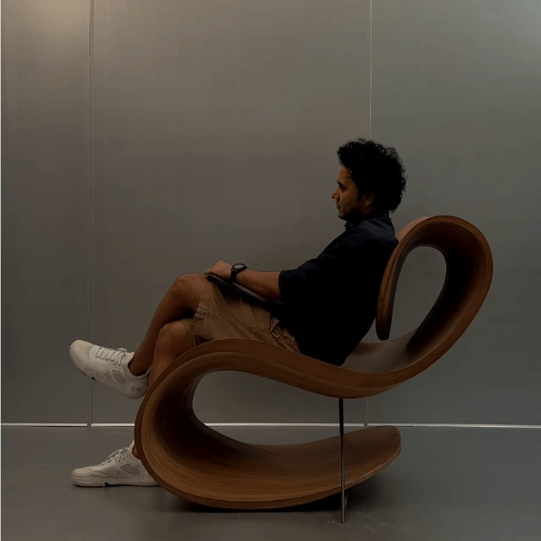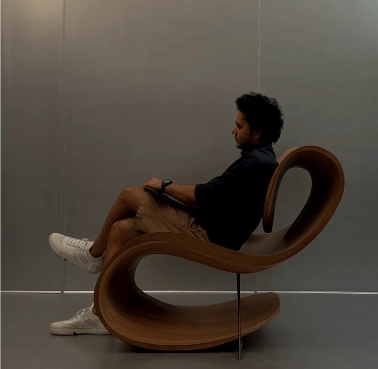 In its neutral posture, the Shift Chaise functions as a standalone object—more sculpture than seat. Its sinuous, double-curved form elicits intrigue and invites contemplation ambiguity and draws the eye across its flowing silhouette before it ever invites use. In this mode, it becomes a spatial statement: an object of visual rhythm, material innovation, and sculptural poise.